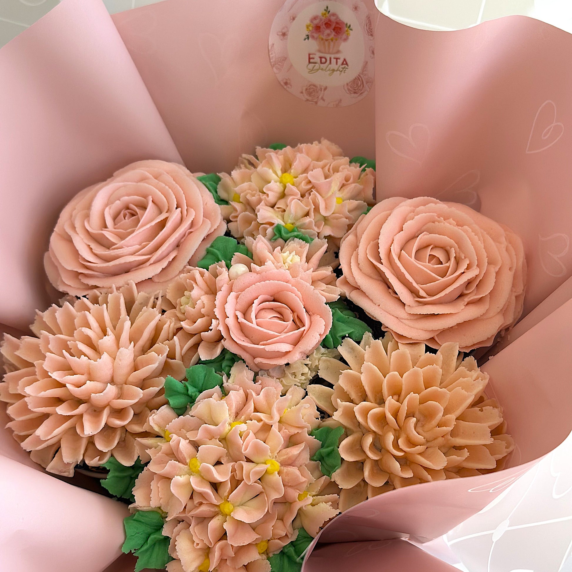 - Handcrafted cupcakes arranged like a floral bouquet.
